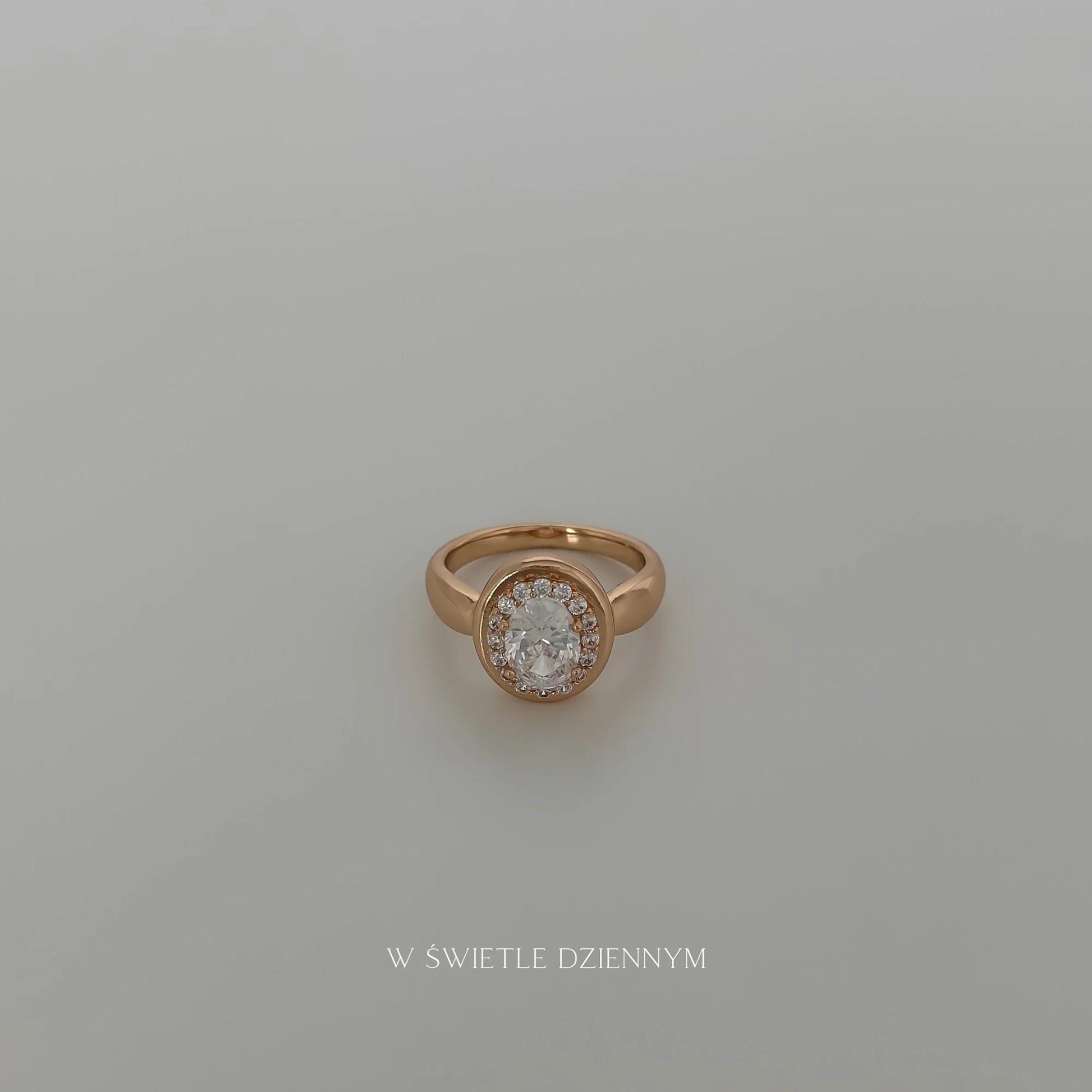 Pierścionek w stylu retro. Zdobiony dużym, błyszczącym, owalnym kamieniem.