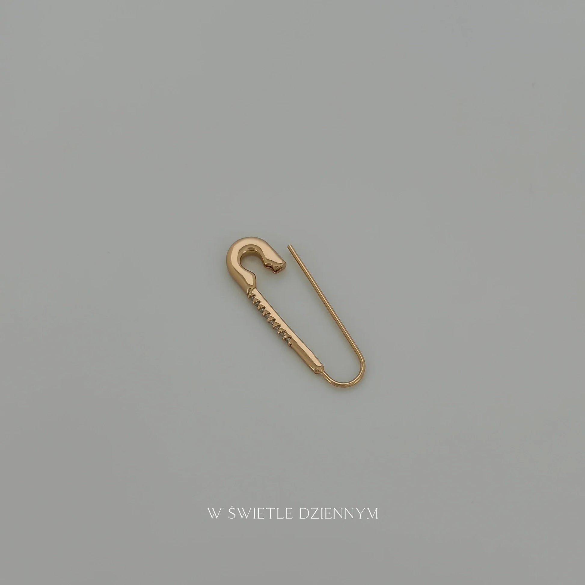 Pozłacane kolczyki w kształcie agrafek, dodające odrobinę oryginalności do każdej stylizacji. Smukły, nietypowy design sprawia, że kolczyki są subtelne, a jednocześnie przyciągające wzrok. Można używać jako zwykłą agrafkę do swetrów czy szalików o luźnym splocie.