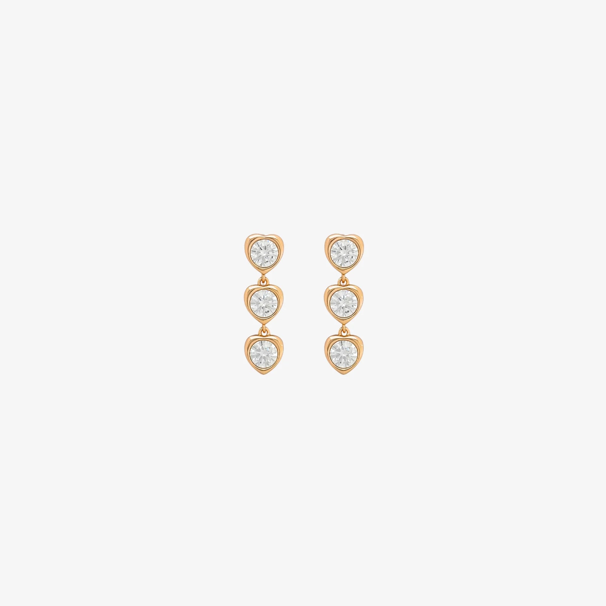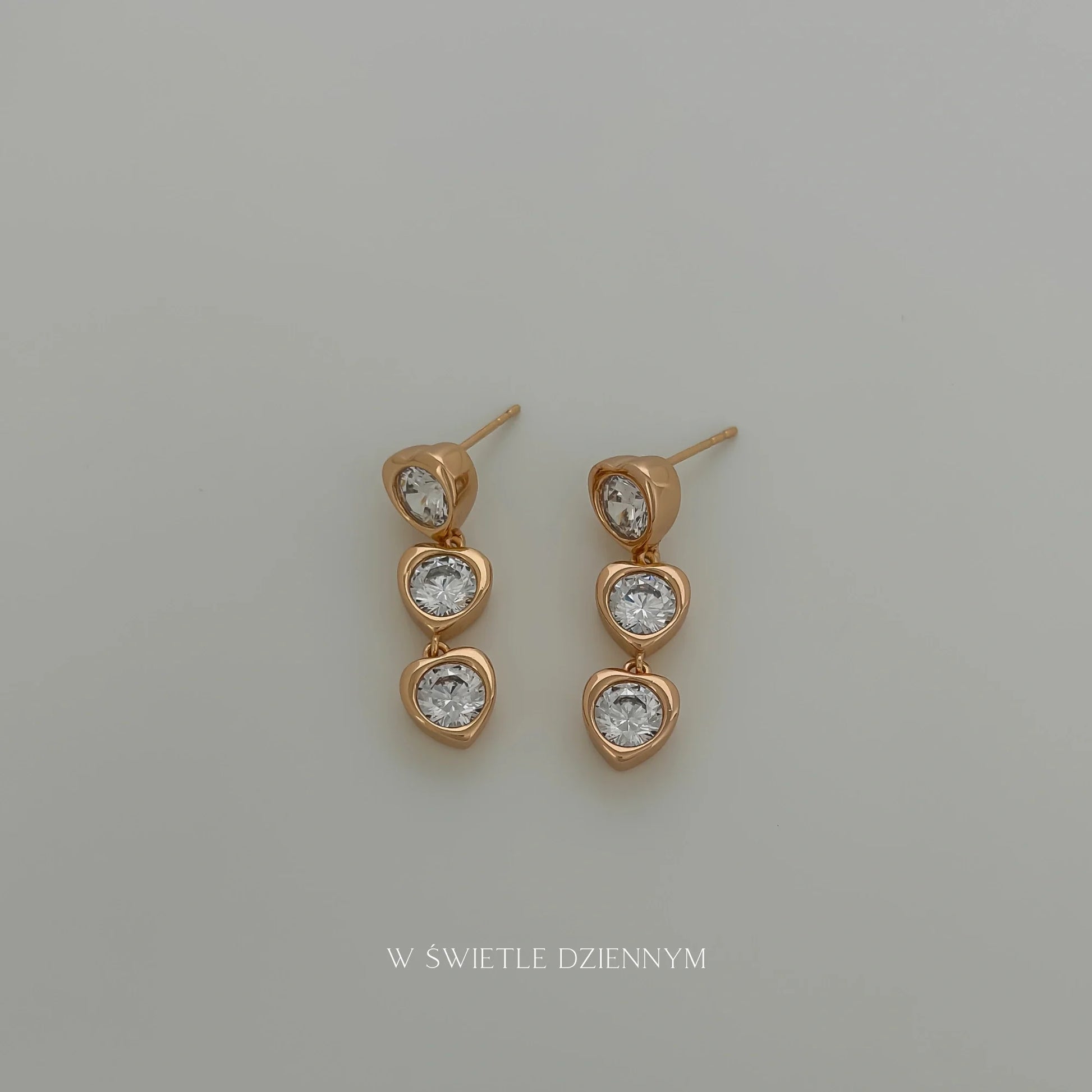 Pozłacane, wiszące kolczyki z trzema okrągłymi cyrkoniami, ułożonymi w pionowej linii. Cyrkonie osadzone są w delikatnych, trójkątnych oprawach, co nadaje im subtelnego blasku. Kolczyki mają zapięcie na sztyft, które zapewnia wygodę noszenia.
