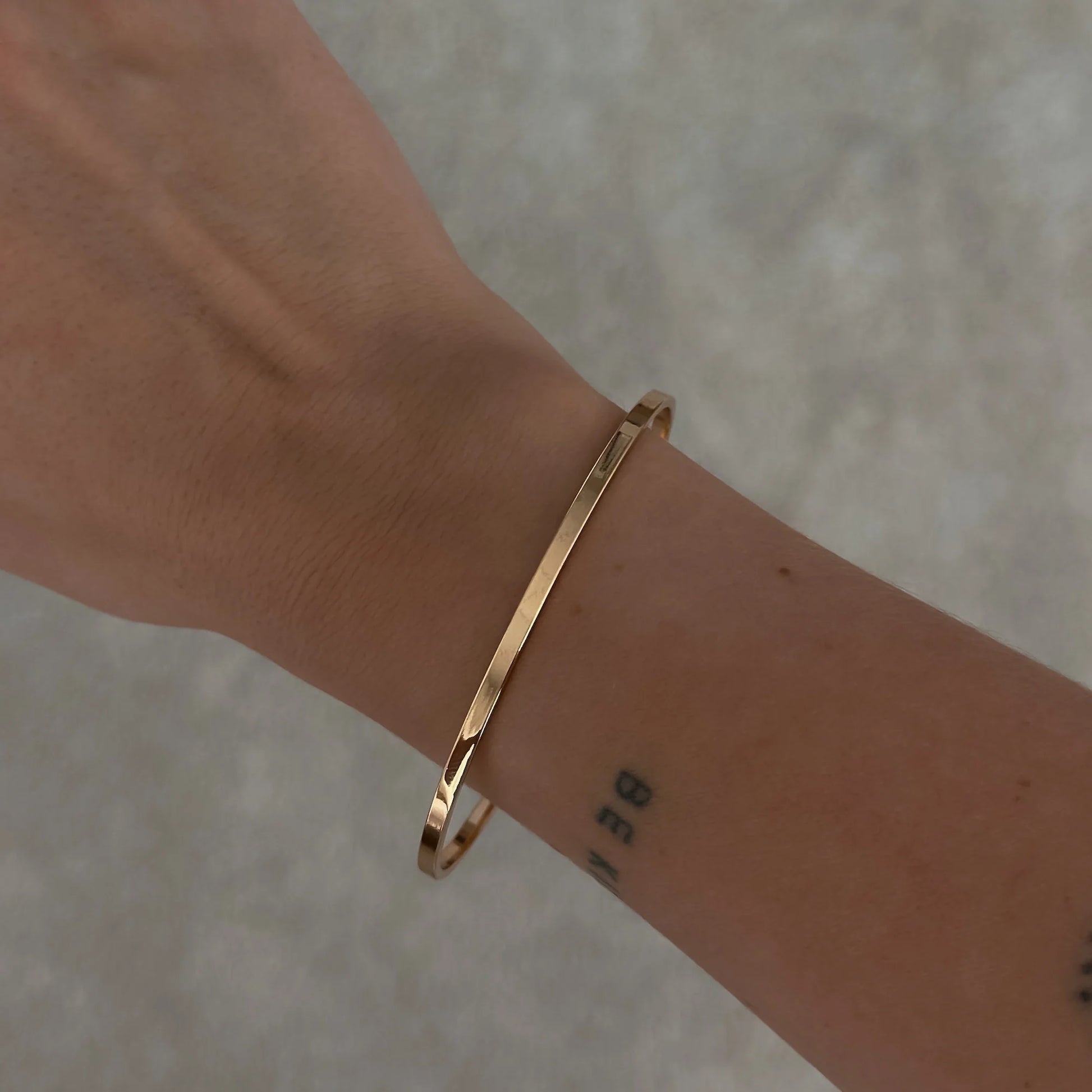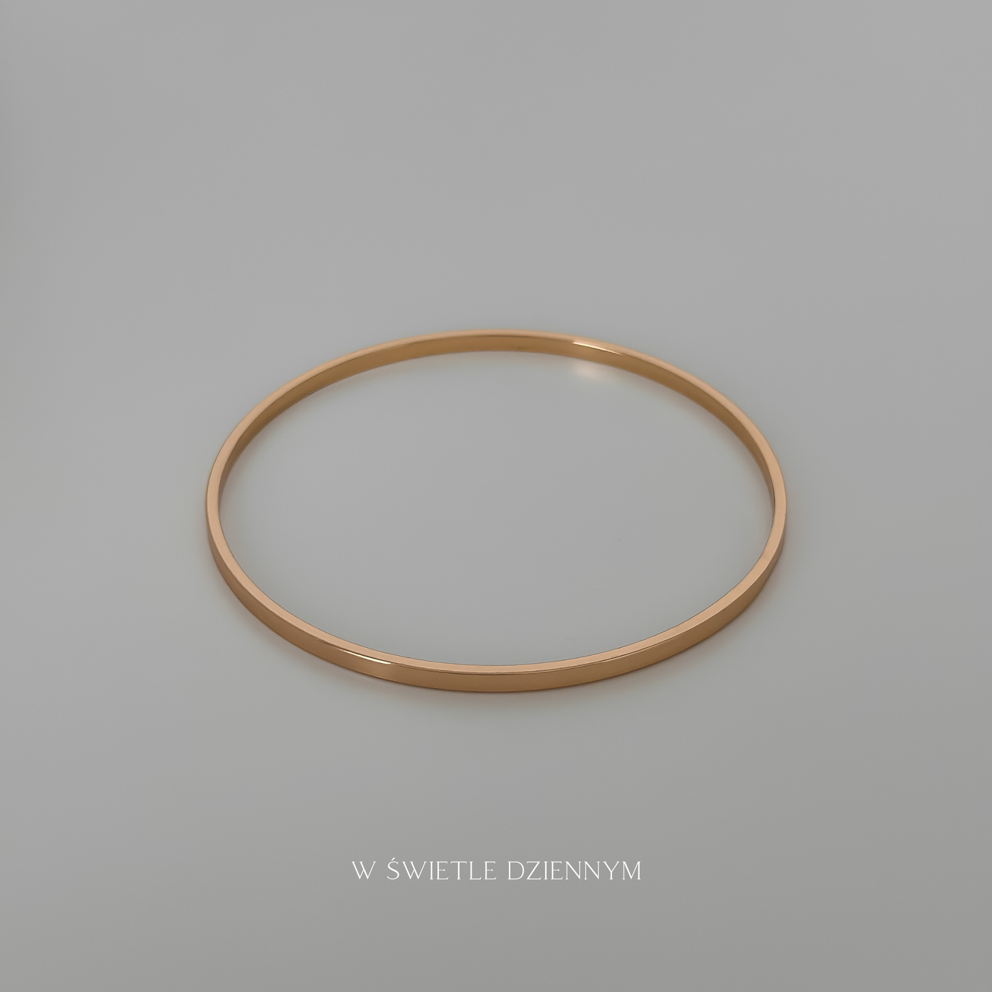 Sztywna bransoletka typu bangle, cieńsza, o prostych krawędziach.