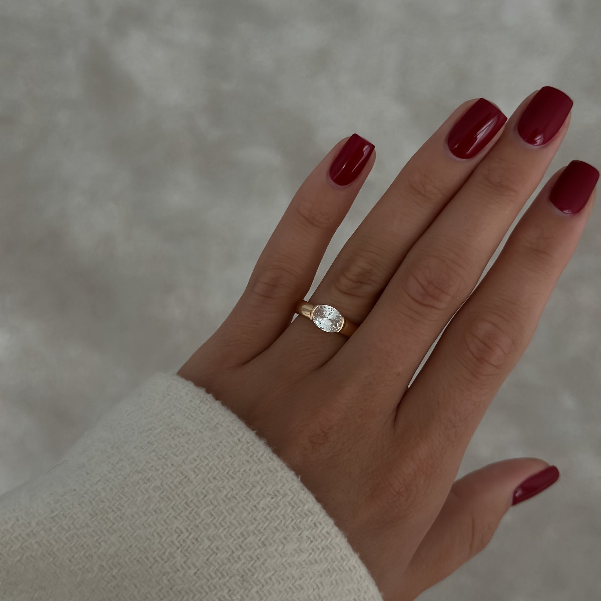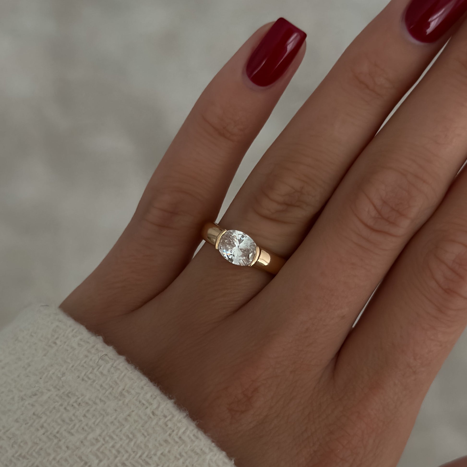 Pierścionek z szerszą obrączką i ozdobną, owalną cyrkonią.