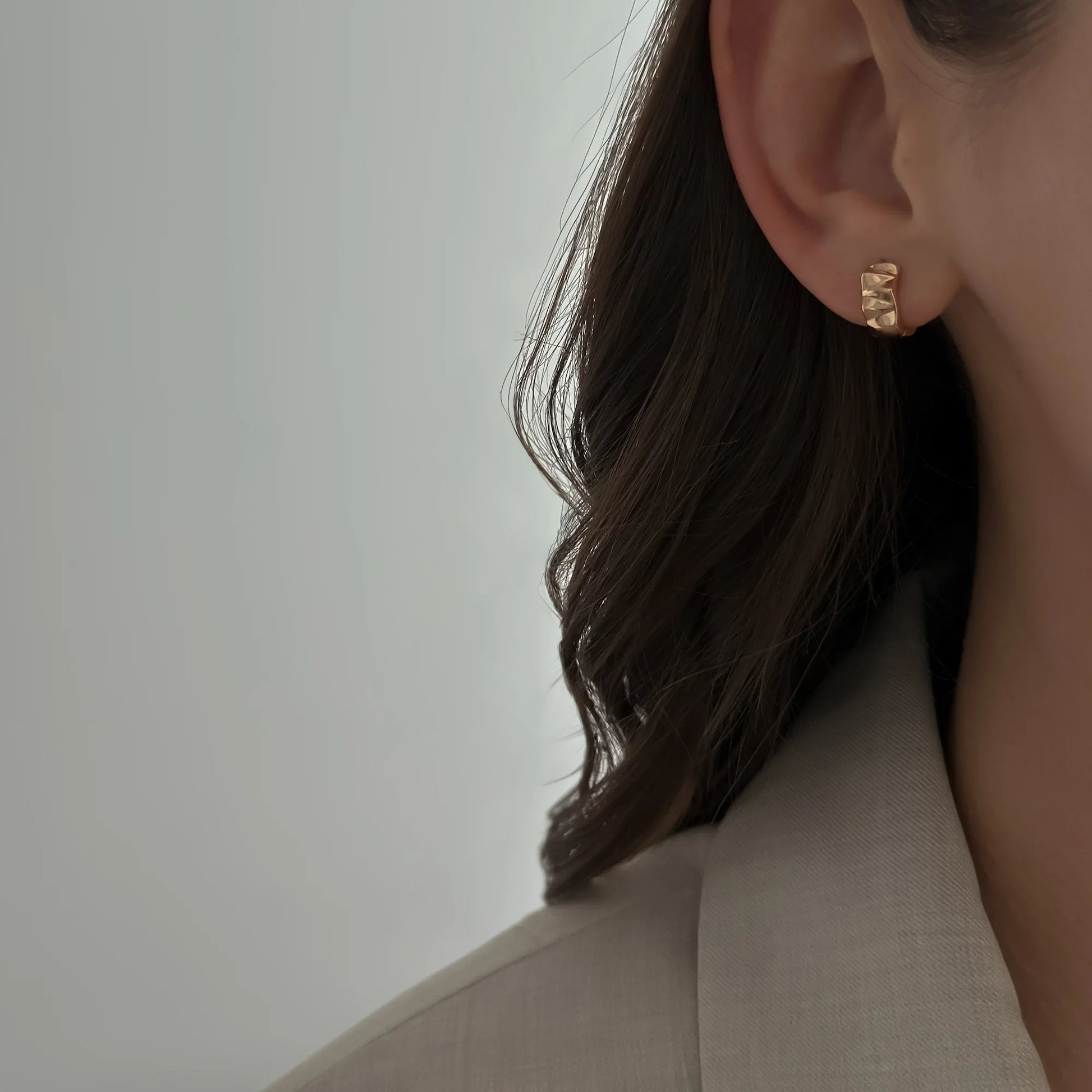 Mniejsze, szersze kolczyki, częściowo o geometrycznej strukturze, częściowo gładkie.