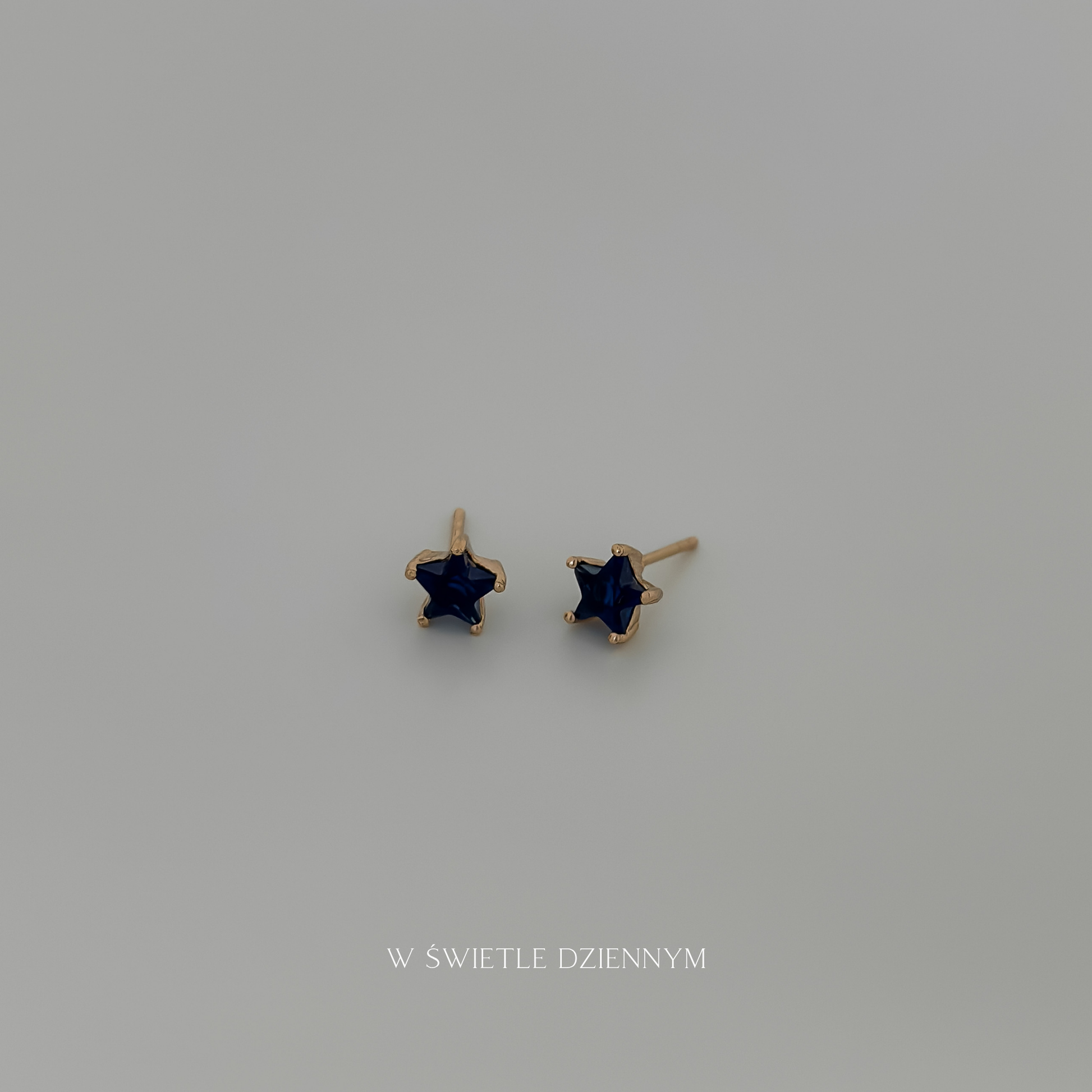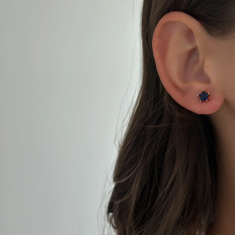 Kolczyki sztyfty z średnim, kamieniem o szafirowym kolorze w kształcie gwiazdy.